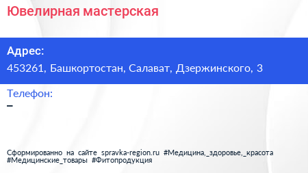 Ювелирная мастерская по адресу 453261, Башкортостан, Салават, Дзержинского, 3 в дальнейшем Организация, размещена в следующих категориях: