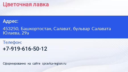 Цветочная лавка по адресу 453250, Башкортостан, Салават, бульвар Салавата Юлаева, 29а в дальнейшем Организация, размещена в следующих категориях: