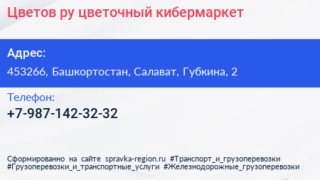 Цветов.ру, цветочный кибермаркет по адресу 453266, Башкортостан, Салават, Губкина, 2 в дальнейшем Организация, размещена в следующих категориях: