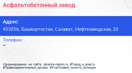 Асфальтобетонный завод по адресу 453256, Башкортостан, Салават, Нефтезаводская, 22 в дальнейшем Организация, размещена в следующих категориях: