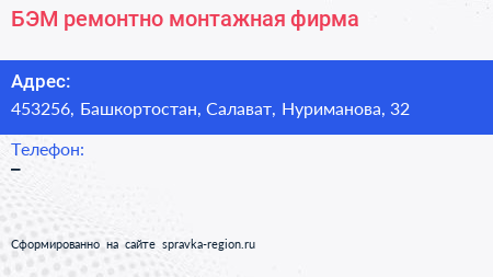 БЭМ, ремонтно-монтажная фирма по адресу 453256, Башкортостан, Салават, Нуриманова, 32 в дальнейшем Организация, размещена в следующих категориях: