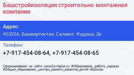 Башстройизоляция, строительно-монтажная компания по адресу 453256, Башкортостан, Салават, Кудаша, 2в в дальнейшем Организация, размещена в следующих категориях: