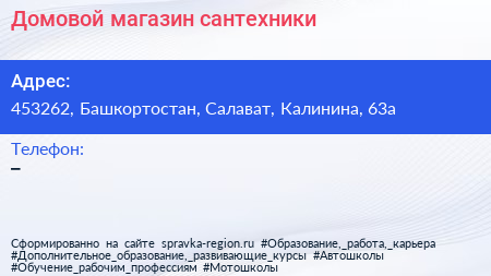 Домовой, магазин сантехники по адресу 453262, Башкортостан, Салават, Калинина, 63а в дальнейшем Организация, размещена в следующих категориях: