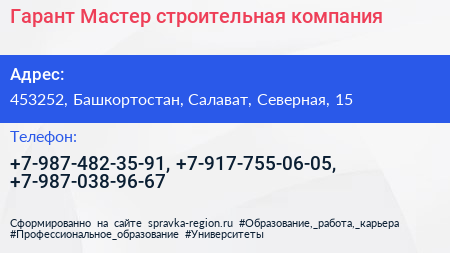Гарант Мастер, строительная компания по адресу 453252, Башкортостан, Салават, Северная, 15 в дальнейшем Организация, размещена в следующих категориях: