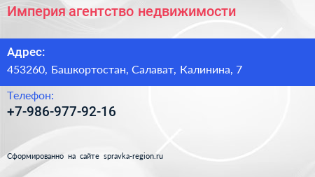 Империя, агентство недвижимости по адресу 453260, Башкортостан, Салават, Калинина, 7 в дальнейшем Организация, размещена в следующих категориях: