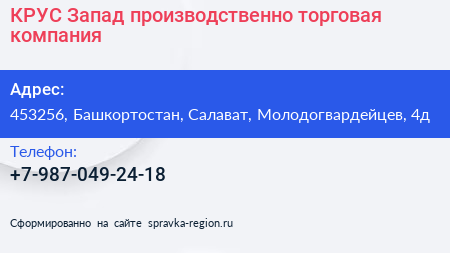КРУС-Запад, производственно-торговая компания по адресу 453256, Башкортостан, Салават, Молодогвардейцев, 4д в дальнейшем Организация, размещена в следующих категориях: