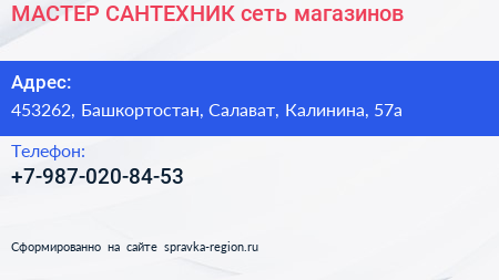 МАСТЕР САНТЕХНИК, сеть магазинов по адресу 453262, Башкортостан, Салават, Калинина, 57а в дальнейшем Организация, размещена в следующих категориях: