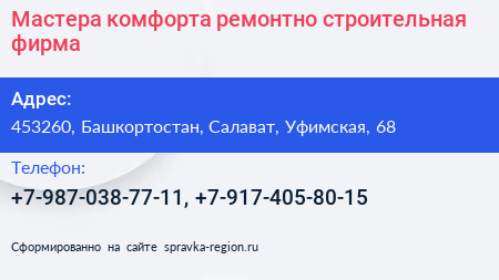 Мастера комфорта, ремонтно-строительная фирма по адресу 453260, Башкортостан, Салават, Уфимская, 68 в дальнейшем Организация, размещена в следующих категориях: