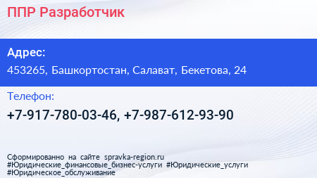 ППР-Разработчик по адресу 453265, Башкортостан, Салават, Бекетова, 24 в дальнейшем Организация, размещена в следующих категориях:
