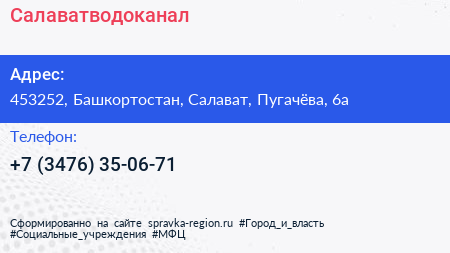 Салаватводоканал по адресу 453252, Башкортостан, Салават, Пугачёва, 6а в дальнейшем Организация, размещена в следующих категориях: