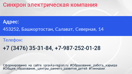 Синхрон, электрическая компания по адресу 453252, Башкортостан, Салават, Северная, 14 в дальнейшем Организация, размещена в следующих категориях: