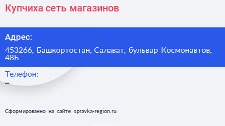 Купчиха, сеть магазинов по адресу 453266, Башкортостан, Салават, бульвар Космонавтов, 48Б в дальнейшем Организация, размещена в следующих категориях: