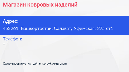 Магазин ковровых изделий по адресу 453261, Башкортостан, Салават, Уфимская, 27а ст1 в дальнейшем Организация, размещена в следующих категориях: