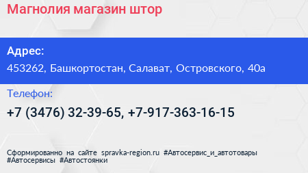 Магнолия, магазин штор по адресу 453262, Башкортостан, Салават, Островского, 40а в дальнейшем Организация, размещена в следующих категориях: