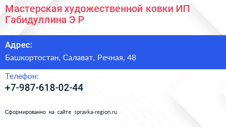 Мастерская художественной ковки, ИП Габидуллина Э.Р. по адресу Башкортостан, Салават, Речная, 48 в дальнейшем Организация, размещена в следующих категориях: