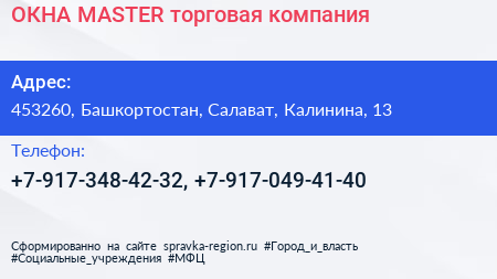 ОКНА MASTER, торговая компания по адресу 453260, Башкортостан, Салават, Калинина, 13 в дальнейшем Организация, размещена в следующих категориях:
