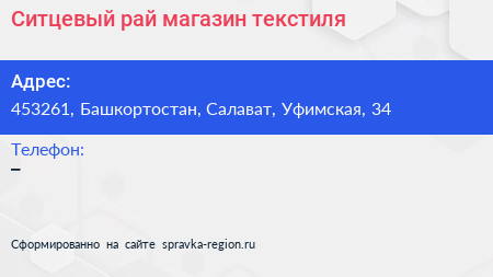 Ситцевый рай, магазин текстиля по адресу 453261, Башкортостан, Салават, Уфимская, 34 в дальнейшем Организация, размещена в следующих категориях: