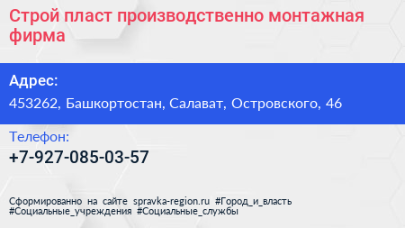 Строй пласт, производственно-монтажная фирма по адресу 453262, Башкортостан, Салават, Островского, 46 в дальнейшем Организация, размещена в следующих категориях: