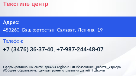 Текстиль-центр по адресу 453260, Башкортостан, Салават, Ленина, 19 в дальнейшем Организация, размещена в следующих категориях: