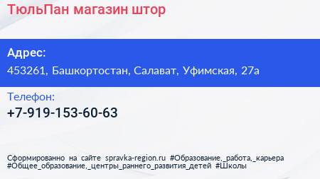 ТюльПан, магазин штор по адресу 453261, Башкортостан, Салават, Уфимская, 27а в дальнейшем Организация, размещена в следующих категориях: