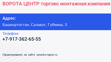 ВОРОТА ЦЕНТР, торгово-монтажная компания по адресу Башкортостан, Салават, Губкина, 3 в дальнейшем Организация, размещена в следующих категориях: