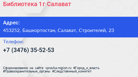 Библиотека №1, г. Салават по адресу 453252, Башкортостан, Салават, Строителей, 23 в дальнейшем Организация, размещена в следующих категориях: