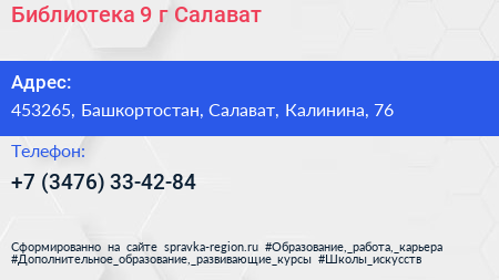 Библиотека №9, г. Салават по адресу 453265, Башкортостан, Салават, Калинина, 76 в дальнейшем Организация, размещена в следующих категориях: