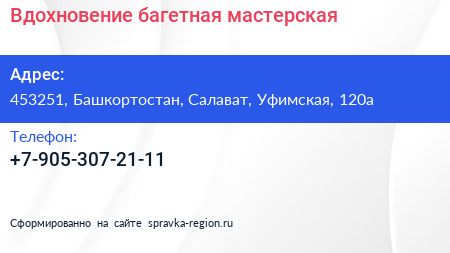 Вдохновение, багетная мастерская по адресу 453251, Башкортостан, Салават, Уфимская, 120а в дальнейшем Организация, размещена в следующих категориях: