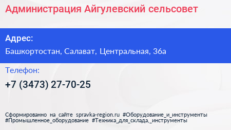 Администрация Айгулевский сельсовет по адресу Башкортостан, Салават, Центральная, 36а в дальнейшем Организация, размещена в следующих категориях: