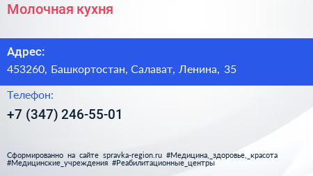 Молочная кухня по адресу 453260, Башкортостан, Салават, Ленина, 35 в дальнейшем Организация, размещена в следующих категориях: