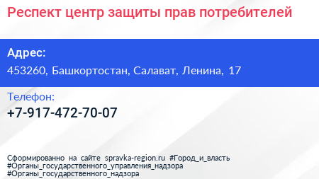 Респект, центр защиты прав потребителей по адресу 453260, Башкортостан, Салават, Ленина, 17 в дальнейшем Организация, размещена в следующих категориях: