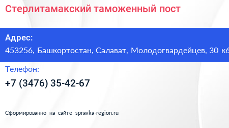Стерлитамакский таможенный пост по адресу 453256, Башкортостан, Салават, Молодогвардейцев, 30 к6 в дальнейшем Организация, размещена в следующих категориях: