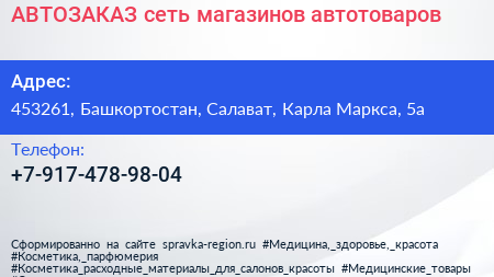 АВТОЗАКАЗ, сеть магазинов автотоваров по адресу 453261, Башкортостан, Салават, Карла Маркса, 5а в дальнейшем Организация, размещена в следующих категориях: