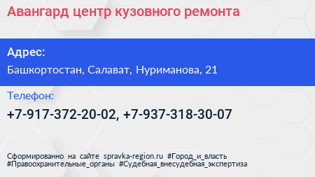 Авангард, центр кузовного ремонта по адресу Башкортостан, Салават, Нуриманова, 21 в дальнейшем Организация, размещена в следующих категориях: