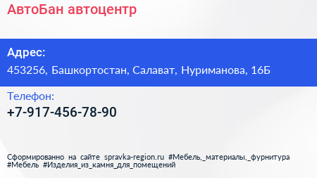 АвтоБан, автоцентр по адресу 453256, Башкортостан, Салават, Нуриманова, 16Б в дальнейшем Организация, размещена в следующих категориях: