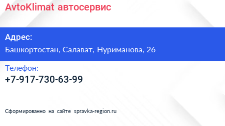 AvtoKlimat, автосервис по адресу Башкортостан, Салават, Нуриманова, 26 в дальнейшем Организация, размещена в следующих категориях: