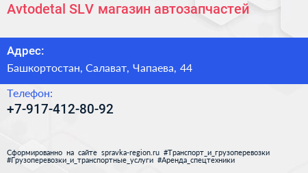 Avtodetal-SLV, магазин автозапчастей по адресу Башкортостан, Салават, Чапаева, 44 в дальнейшем Организация, размещена в следующих категориях:
