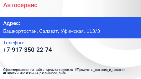 Автосервис по адресу Башкортостан, Салават, Уфимская, 113/3 в дальнейшем Организация, размещена в следующих категориях: