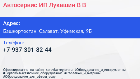 Автосервис, ИП Лукашин В.В. по адресу Башкортостан, Салават, Уфимская, 9Б в дальнейшем Организация, размещена в следующих категориях: