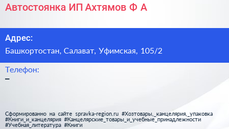 Автостоянка, ИП Ахтямов Ф.А. по адресу Башкортостан, Салават, Уфимская, 105/2 в дальнейшем Организация, размещена в следующих категориях: