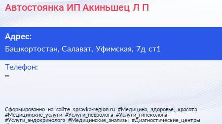 Автостоянка, ИП Акиньшец Л.П. по адресу Башкортостан, Салават, Уфимская, 7д ст1 в дальнейшем Организация, размещена в следующих категориях: