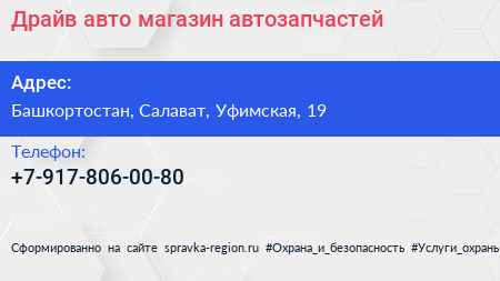 Драйв-авто, магазин автозапчастей по адресу Башкортостан, Салават, Уфимская, 19 в дальнейшем Организация, размещена в следующих категориях: