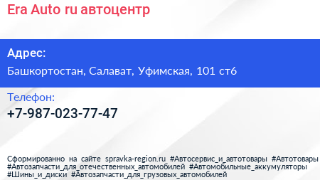 Era-Auto.ru, автоцентр по адресу Башкортостан, Салават, Уфимская, 101 ст6 в дальнейшем Организация, размещена в следующих категориях: