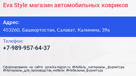 Eva Style, магазин автомобильных ковриков по адресу 453260, Башкортостан, Салават, Калинина, 39а в дальнейшем Организация, размещена в следующих категориях: