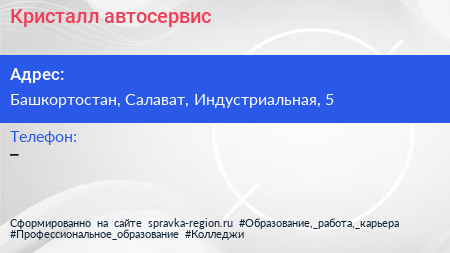 Кристалл, автосервис по адресу Башкортостан, Салават, Индустриальная, 5 в дальнейшем Организация, размещена в следующих категориях: