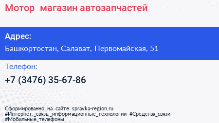 Мотор+, магазин автозапчастей по адресу Башкортостан, Салават, Первомайская, 51 в дальнейшем Организация, размещена в следующих категориях: