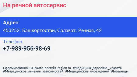 На речной, автосервис по адресу 453252, Башкортостан, Салават, Речная, 42 в дальнейшем Организация, размещена в следующих категориях: