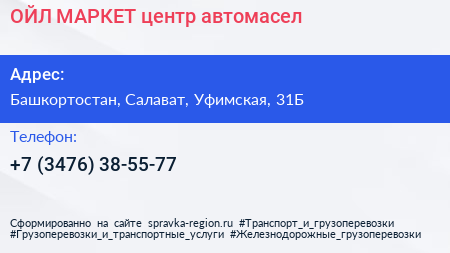 ОЙЛ-МАРКЕТ, центр автомасел по адресу Башкортостан, Салават, Уфимская, 31Б в дальнейшем Организация, размещена в следующих категориях: