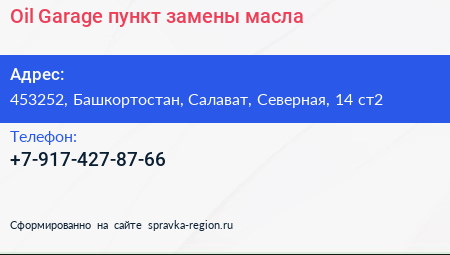Oil Garage, пункт замены масла по адресу 453252, Башкортостан, Салават, Северная, 14 ст2 в дальнейшем Организация, размещена в следующих категориях: