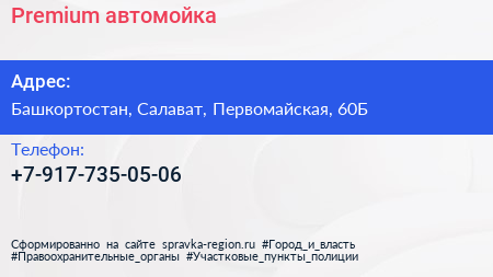 Premium, автомойка по адресу Башкортостан, Салават, Первомайская, 60Б в дальнейшем Организация, размещена в следующих категориях: